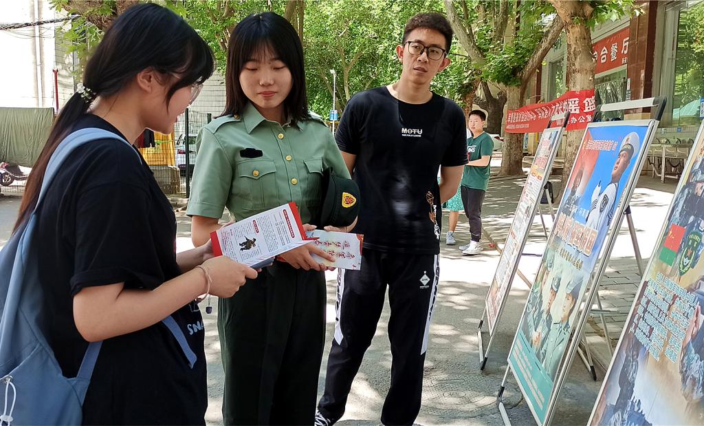 植入初心,创新宣传模式。上半年,面向应往届毕业生,校院联动,通过微信公众平台、班级QQ群、微信群及学生干部群等方式,大力宣传大学生入伍优惠政策;下半年,通过举办“征兵宣传进高校宣讲会”、聘任师生担任“大学生征兵宣传员”、在校内学生集中区域设立征兵宣传站、在各招聘会现场设立征兵宣传点、向学生发放征兵宣传单、现场为学生解答疑惑等途径,激发学生参军报国积极性,营造良好的校园征兵氛围。