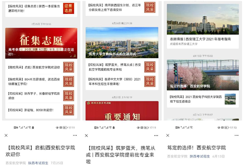 融合多媒体,唱响好声音,提升西航流量。招生就业处联合校团委和各学院,在全校范围抽调精兵强将,组建教师招生咨询团和学生志愿服务团两支队伍,组织开展4场招生宣传员及志愿者培训会,专门编制《招生咨询服务手册》,不断提升咨询服务的专业度和影响力;按照常态化疫情防控要求,6月底至7月份,组织参加20场现场招生咨询会、5场招生宣传直播,利用学校和省级招考部门两级官方平台、地方主流媒体,持续推送招生政策、招生动态等各类招生信息40余条。学校招生微信平台推出“招生专列”“学院风采展”“志愿锦囊”等系列微信推文受到广大师生好评,在志愿填报期间,向陕西考试招生官方微信平台推送3条文章,期间点击量过8.5万次,受到社会的广泛关注。