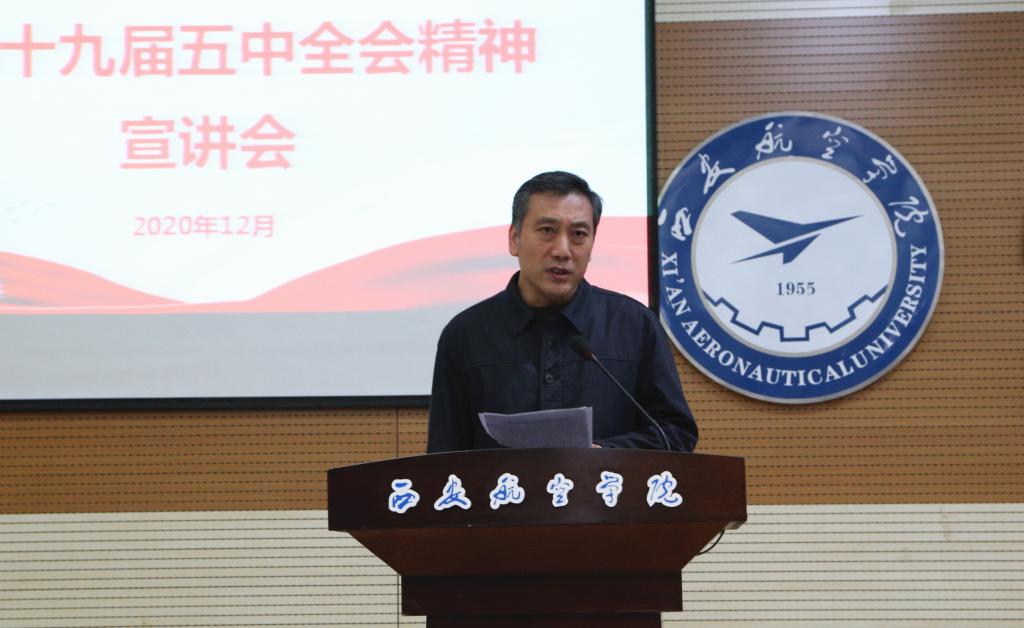 12月16日,党委书记陈平社为阎良校区师生做党的十九届五中全会精神宣讲报告。阎良校区各二级学院党总支书记、党支部书记、全体辅导员、教师及学生代表、职能处室工作人员200余人参加会议。会议由党委副书记韩明军主持。