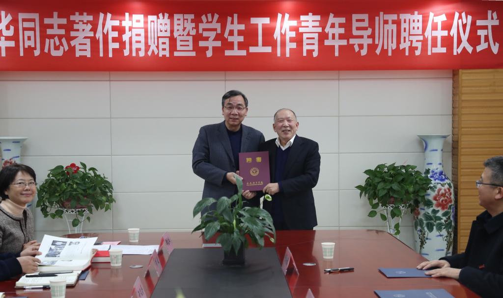 宁永录感谢岳松华同志关心支持学校建设发展,并对岳松华同志主要经历及著作《骄子摇篮》编写背景、主要内容等作了介绍。图书馆馆长郑东红代表学校接受捐赠并向岳松华同志颁发捐赠证书,党委书记陈平社向岳松华同志颁发了学生工作青年导师聘任证书。