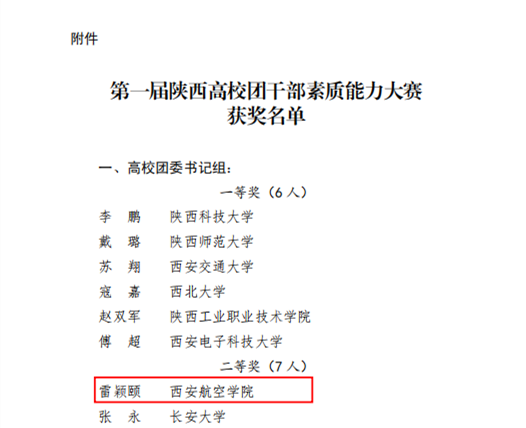 11月20日,共青团陕西省委、陕西省委教育工委联合下发了《关于第一届陕西高校团干部素质能力大赛获奖情况的通报》,威尼斯官网荣获团委书记组二等奖1项、专职教师团干组三等奖2项、学生团干组三等奖1项、学生团干组优秀奖1项。