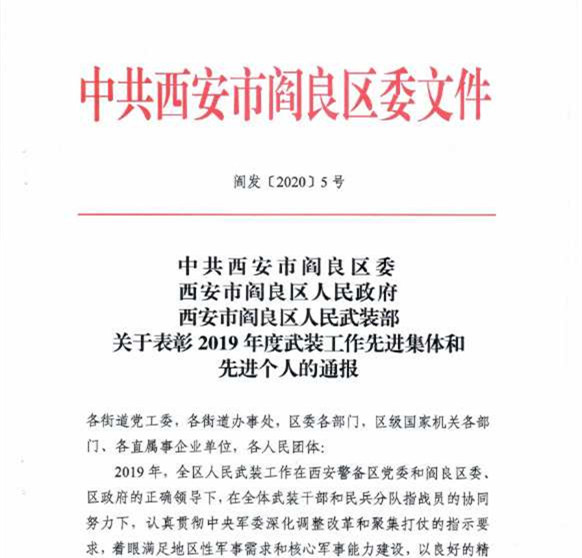 近日,中共西安市莲湖区委、区人民政府、区人民武装部,中共西安市阎良区委、区人民政府、区人民武装部对在2019年征兵工作中表现突出的单位予以表彰通报,威尼斯官网荣获莲湖区、阎良区2019年度征兵工作先进单位,吴伟刚、龙丹分别荣获莲湖区、阎良区征兵工作先进个人。