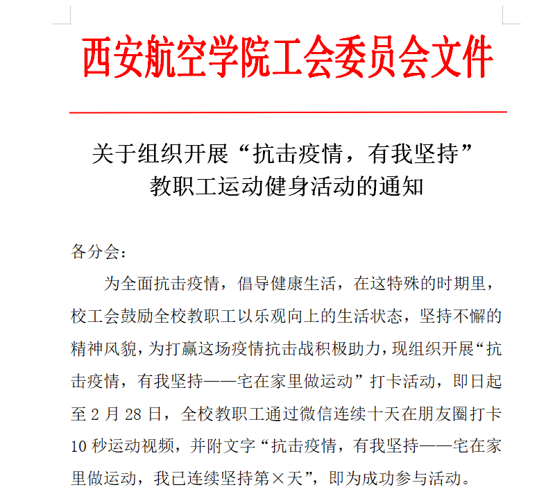 同时,校工会还积极主动开展工作,千方百计为学校职工筹措了开学后的防护物资。通过微信群及时向广大教职工发布防控指南及学校关于疫情防控的相关通知和要求,号召全体教职工坚决服从学校疫情防控工作安排,提高认识,听从指挥,按照“外防输入,内防扩散”要求,主动切断疫情传播途径,做好自身和家人健康管理。为倡导健康生活,积极鼓励全校教职工以乐观向上的生活态度,助力打赢这场疫情抗击战,组织开展了“抗击疫情,有我坚持——宅在家里做运动”打卡活动,受到广大教职工的积极响应,有效增强了教职工身体免疫力。