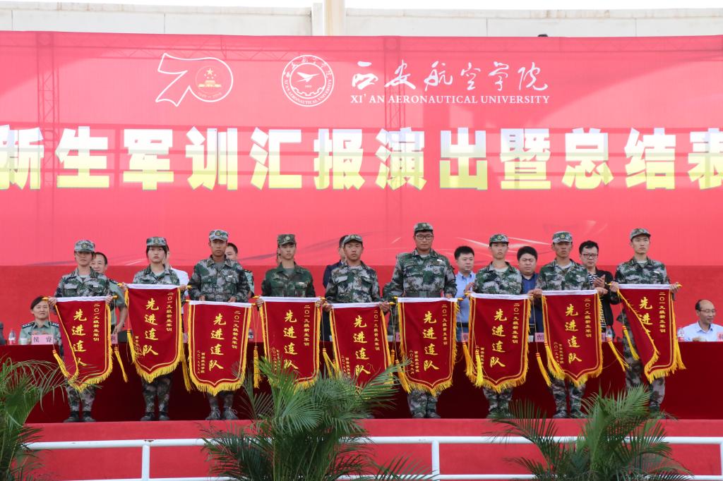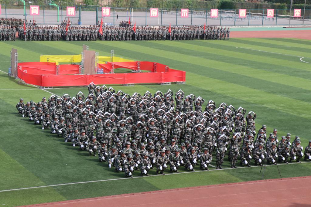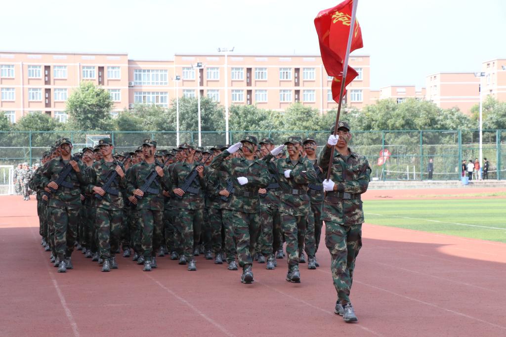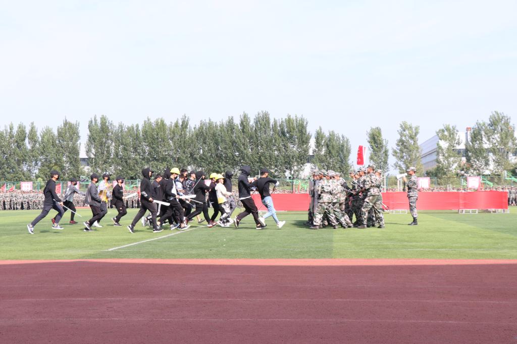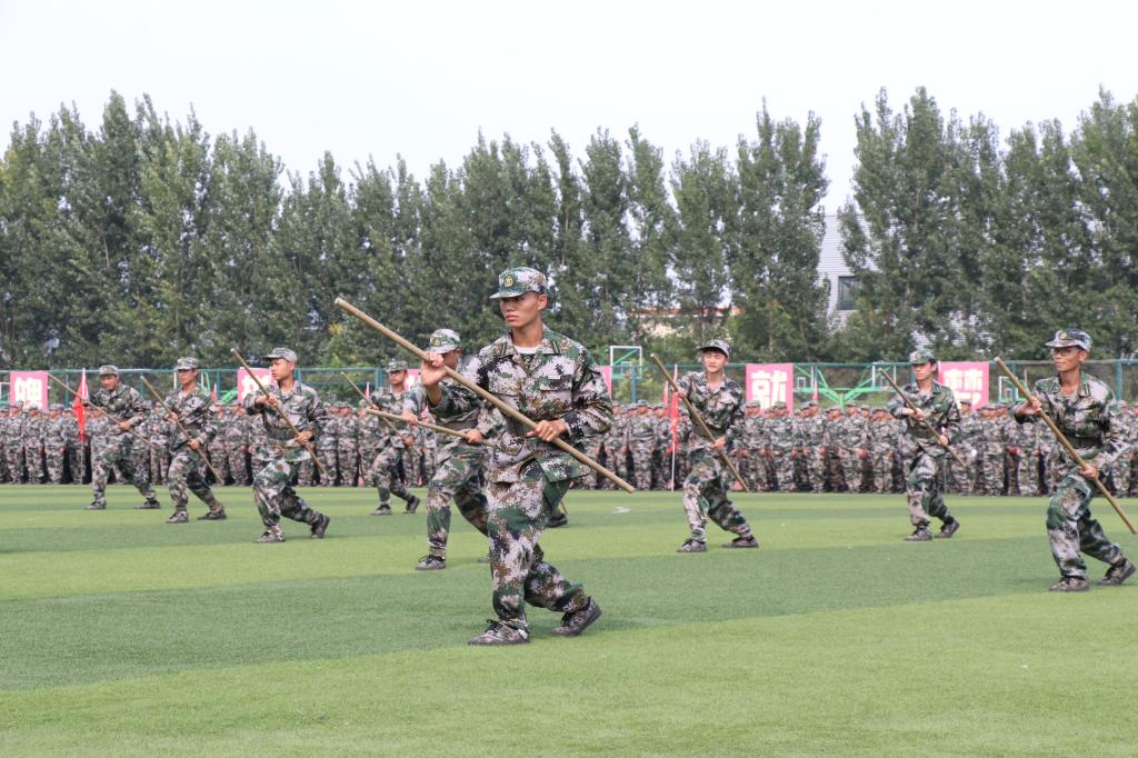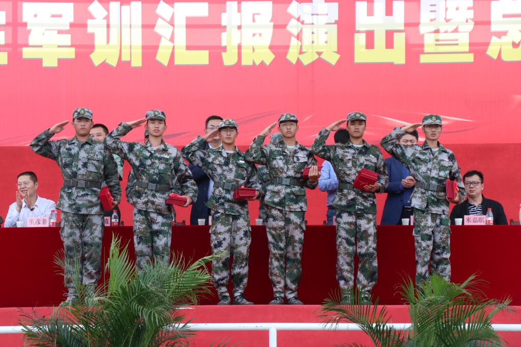 军训汇报演出暨总结表彰大会在庄严的国歌声中拉开帷幕。伊始,女生营精心排演花样队列精准走位,摆出了“新中国70周年”等图案和字样表达祝福祖国的喜悦之情。接着,参训学员们通过分列式、匕首操、擒敌配套、刺杀操、格斗棍术、军体拳、反恐演练等展示了14天来的训练成果。分列式表演在铿镪顿挫的解放军进行曲中进行,同学们斗志昂扬、精神抖擞接受大会的检阅。军体拳呐喊雷动、气势如虹。刺杀操表演刚劲强健、震人心魄。擒敌配套表演体现了铮铮铁骨、血性刚强的士官生形象。反恐演练将时事热点进行改编,表达了同学们祝福和平、抵制暴力的心愿。整个汇报表演给所有新生上了一堂生动的爱国主义教育课和国防教育课。