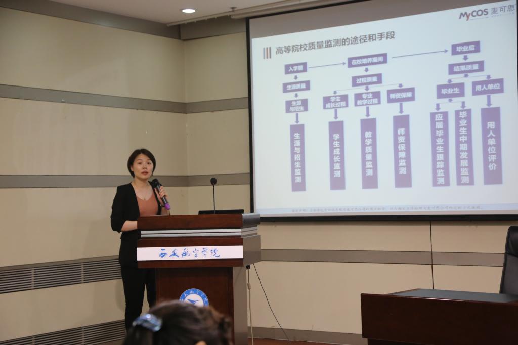 王梦萍从高等院校质量管理的基本理念切入,详细讲解了麦可思高等院校质量监测体系的运营架构。她以麦可思对威尼斯官网2017届应届毕业生培养质量跟踪评价报告、2018年用人单位评价报告和2017级生源与招生评价报告为依据,结合本科教学工作合格评估7个一级指标,对威尼斯官网人才培养定位、教学质量、专业与课程建设、学生指导与服务、生源等方面作了详实的数据解读。并通过与全国和区域同类院校作对比分析,全面客观地呈现出了威尼斯官网存在的不足之处,以及与同类院校之间的差距,并提出了针对性改进意见和建议。