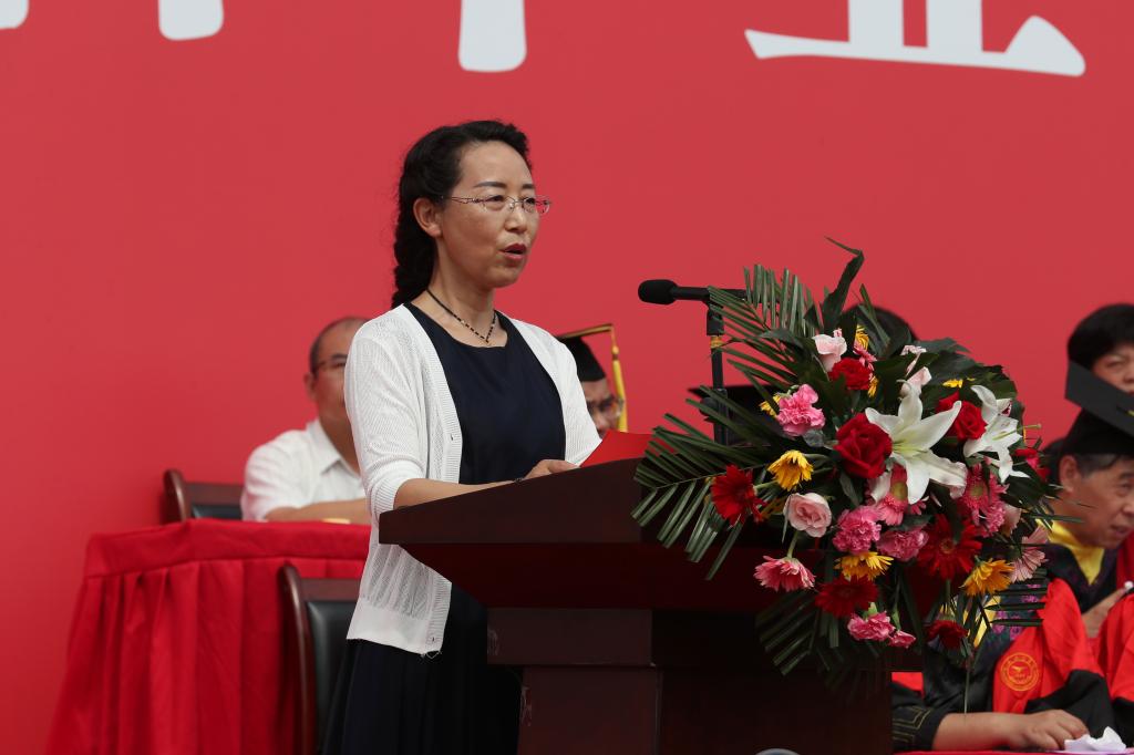 王芳女士代表毕业生家长向为孩子们健康成长付出辛劳的学校领导、老师们表示最崇高的敬意和最衷心的感谢。她寄语毕业生们要饮水思源莫忘母校师恩,仰望星空牢记终身学习,肩负起发展学术、服务社会和报效祖国的历史使命。