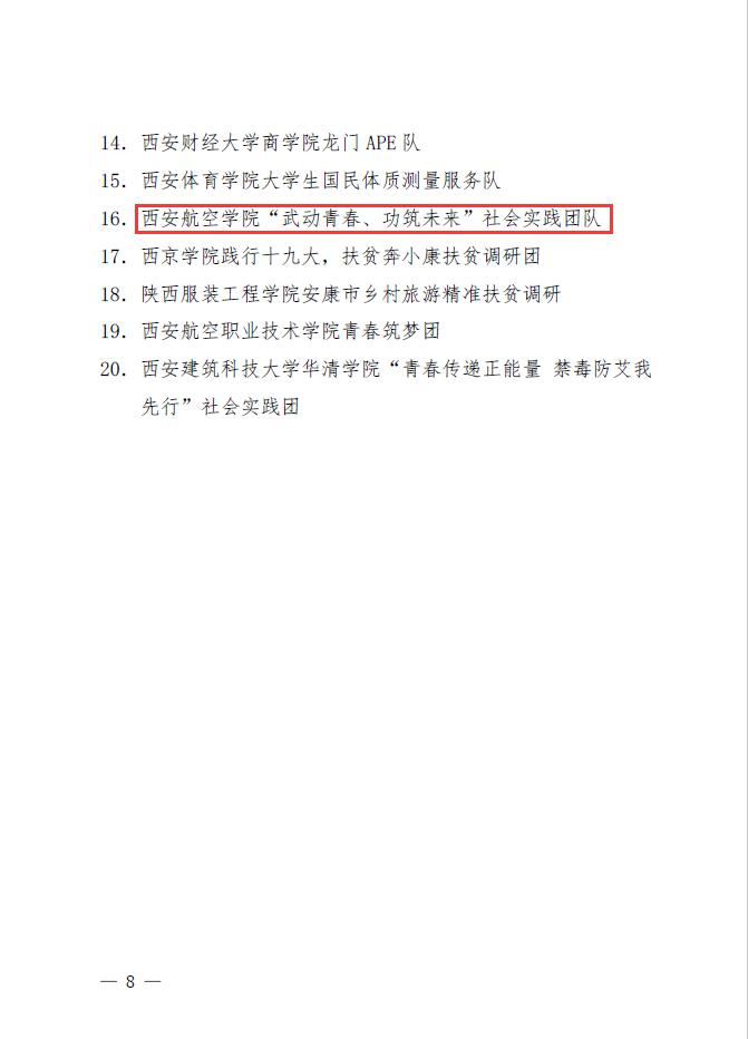 在团省委组织的2018年陕西省大中专学生“三下乡”社会实践活动评比中,威尼斯官网获2018年陕西省大中专学生“三下乡”社会实践活动优秀组织单位,“武动青春 功筑未来”社会实践队获得省级标兵团队,“奋斗新时代,共赴小康梦”远航支教队及“暖心支教,携手助贫”活动小组2支团队获省级优秀团队,冯仑仑、赵琳获社会实践先进个人。