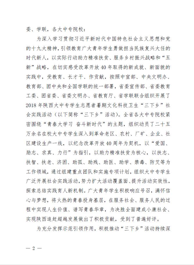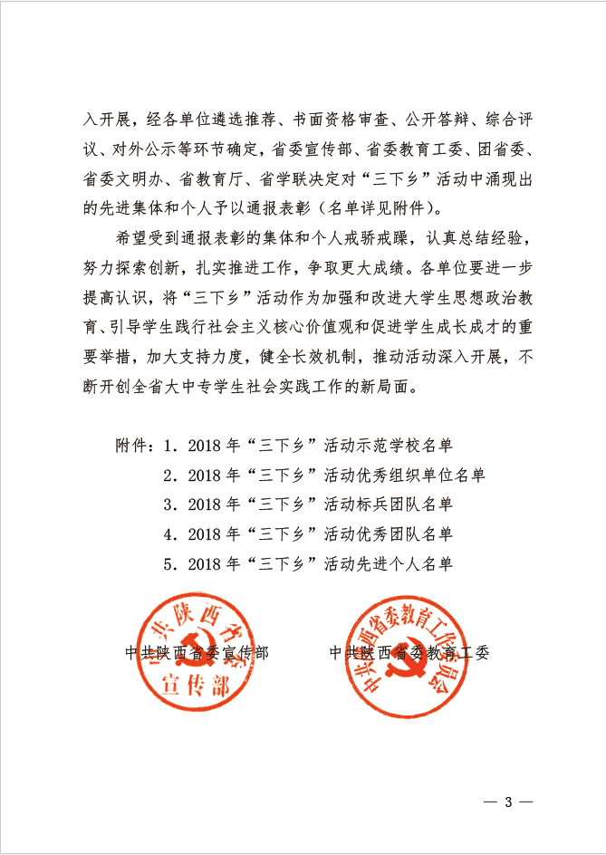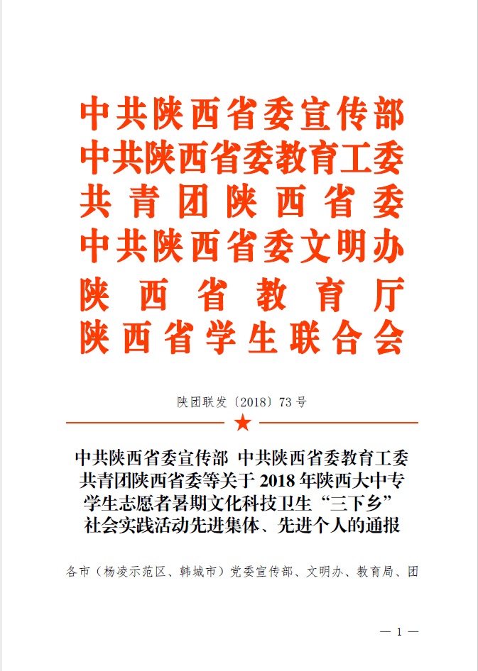 近日,省委教育工委、团省委对2018年陕西省大中专学生“三下乡”社会实践活动及“万名学子扶千村”大学生暑期社会实践扶贫攻坚专项活动评比结果进行公示,威尼斯官网荣获多项省级荣誉。