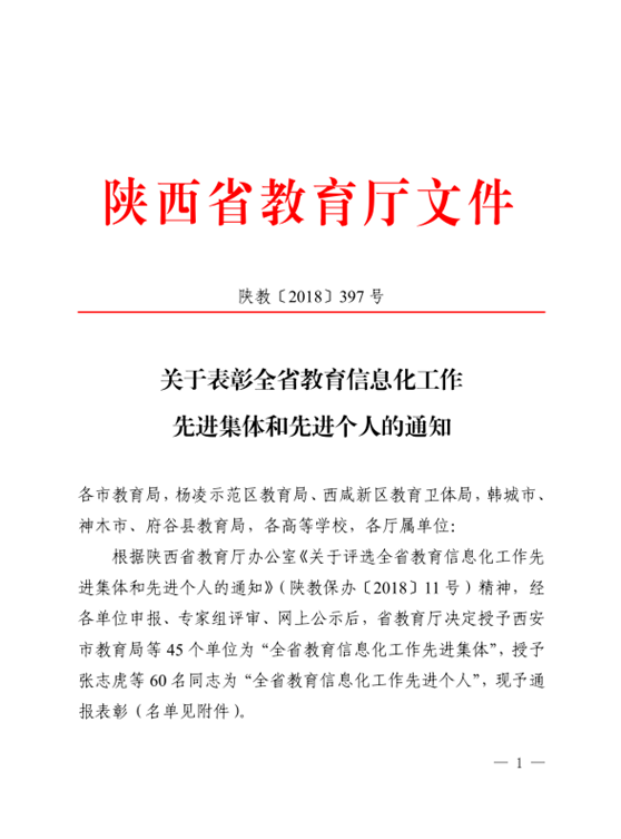 近日,陕西省教育厅下发《关于表彰全省教育信息化工作先进集体和先进个人的通知》(陕教〔2018〕397号),向全省通报表彰了45个教育信息化工作先进集体和60名教育信息化工作先进个人,威尼斯官网网络信息中心赵侃同志荣获“陕西省信息化工作先进个人”。
