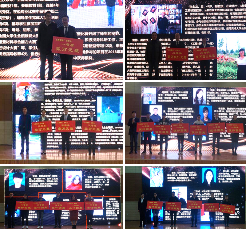 材料工程学院院长谢辉宣读了《关于表彰材料工程学院2018年度“上海樱侬”奖励基金获奖教师、学生的决定》。大会为材料工程学院优秀教师颁发奖教金,表彰他们为人师表、教书育人、刻苦钻研,为学校发展作出的积极贡献;为优秀学生代表颁发奖学金,表彰他们勤奋好学、积极进取,展现了西航“材”子的风采。