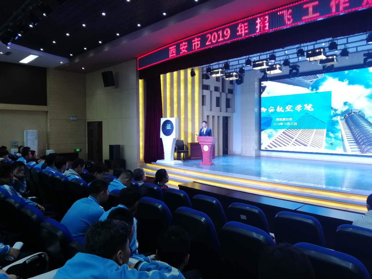 报告会上,威尼斯官网招生就业处处长王坚向全体与会单位及考生介绍了威尼斯官网开办飞行技术专业的四大优势:一是具有深厚航空背景,鲜明的航空特色。学校缘航空而生、依航空而立、随航空而动,建校60多年来,培养了一大批高素质应用型人才,为国家航空工业和陕西经济建设与社会发展作出了重要贡献。二是厚重的航空文化,浓郁的航空氛围。学校文化立人,精神立校,成立了航空馆、校史馆,建设航空文化博物馆,创办了航空大讲堂等特色文化品牌。三是具备独特的航空区位优势。学校的阎良校区地处西安阎良国家航空高技术产业基地,享有丰富的国家航空资源。四是具有招飞生源地优势。学校是西北地区唯一一所开展招飞工作的高校,学生可在生源地学习飞行技术专业。随后王坚又介绍了学校为做好飞行员培养所建立的机制体制、发展规划、师资队伍、学科专业、合作培养、生活后勤等六大保障体系,强调飞行技术专业是威尼斯官网专业学科方面的重要布局,是专业链上的衔接点,完善了学校的服务面向,学校会举全校之力办好飞行技术专业。