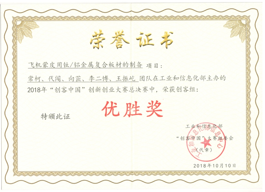 由工业和信息化部主办、工业和信息化部信息中心与广东省经济和信息化委员会联合承办的2018年“创客中国”创新创业大赛全国总决赛在广州举行。本次大赛全国范围内共组织参赛项目8000多个,陕西省仅有2个项目进入全国200强,其中威尼斯官网材料工程学院丁旭教授团队指导的项目《飞机蒙皮用钛/铝金属复合板材的制备》入围全国24强(“企业组”和“创客组”各12强),并作为陕西省唯一的项目入围“创客组”12强。经过全国总决赛现场展示和路演,威尼斯官网项目获得2018年“创客中国”创新创业大赛全国总决赛“创客组”第8名,同时荣获大赛“优胜奖”。