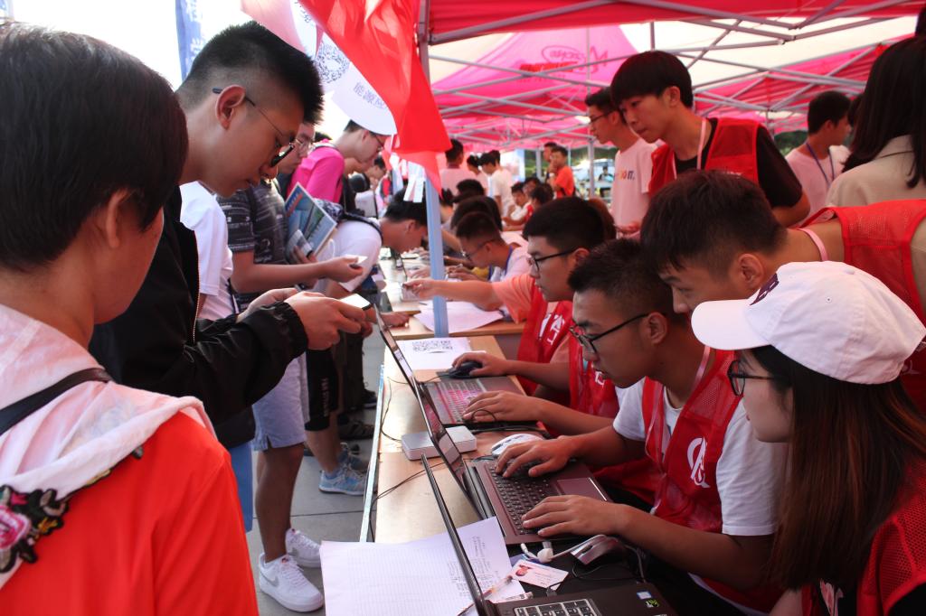服务用心、新生暖心。学校使用数字迎新系统,简化现场报到流程,提高效率。防骗指南、校园攻略、校区平面图、报到流程图、醒目的水座旗、有序的导引牌处处体现了用心的服务。今年学校增设了“实时报道人数统计屏”实时呈现新生报到情况。身着天空蓝的学生志愿者们在道路指引、用品发放、搬运行李的现场构成了一道亮丽的风景线。萌新心愿墙、新生签名墙等留念活动吸引了大量的新生及家长参与留念。