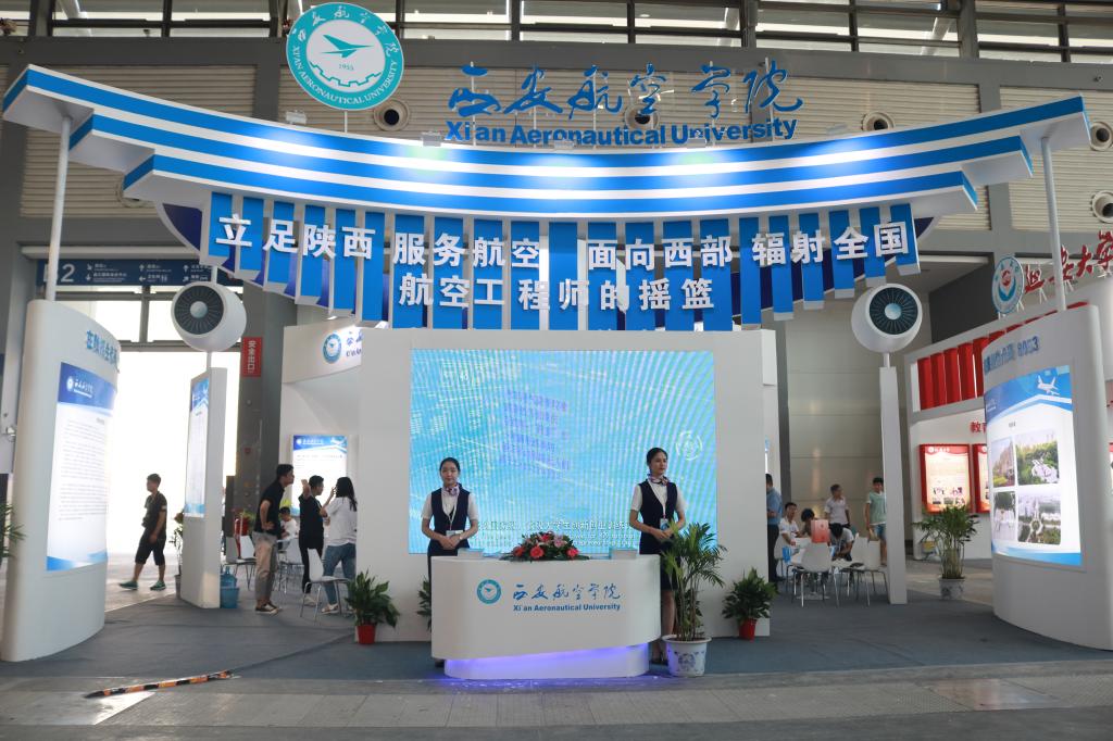 威尼斯官网展区位于国际会展中心B2馆,设计以航空蓝色为主色调,以学校基本情况、招生章程、特色招生、招生计划及二级学院情况简介为布展内容。