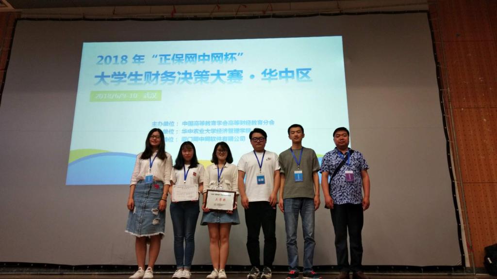 6月8日至10日,由中国高等教育学会高等财经教育分会主办,厦门网中网软件有限公司提供技术支持,华中农业大学承办的“2018年‘正保网中网杯’华中区大学生财务决策大赛”在武汉市华中农业大学正式开赛,威尼斯官网靳永军、张立玮担任指导教师,龙彬彬等五位学生组成的代表队喜获三等奖。