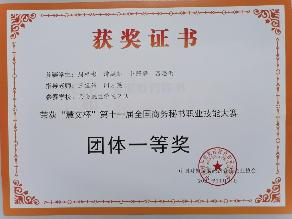 近日,由中国对外贸易经济合作企业协会主办,全国商务秘书与行政助理专家委员会、湖州职业技术学院承办的“慧文杯”第十一届全国商务秘书职业技能大赛圆满落幕。本届大赛采用线上形式进行,大赛共有来自全国19个省87所院校的159支队伍参赛。威尼斯官网由人文学院王宝伟、徐蕾、吴丹、闫月英老师指导的秘书学专业学生组成两支队伍参加了比赛,经过激烈角逐,最终荣获团体一等奖和团体二等奖各一项,任芯彤同学荣获案例征集个人三等奖。