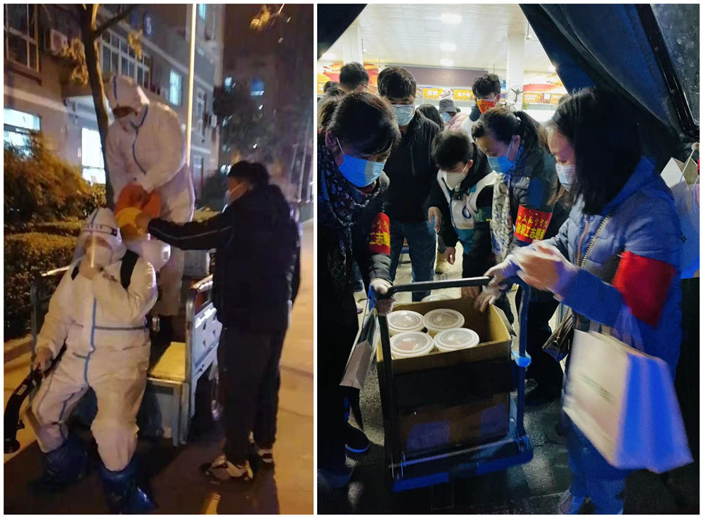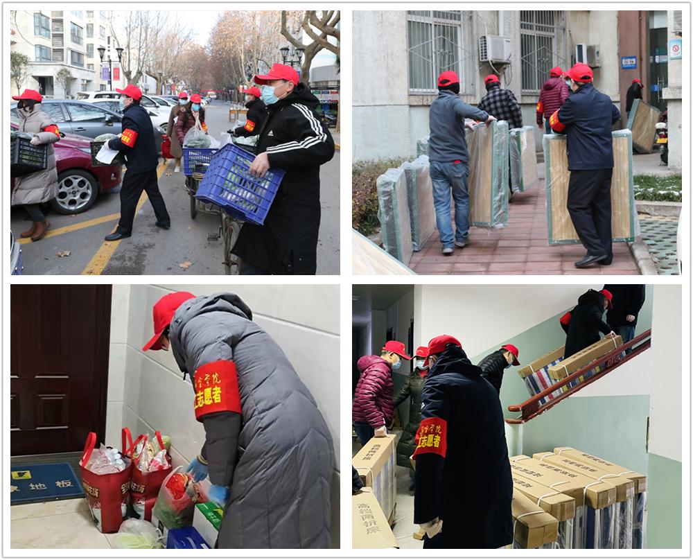 学生宿舍楼进行封控管理后,为做好封闭学生的服务保障工作,校工会发出号召,校内外居住的教职员工积极响应,在短短2个小时内就招募了100名教职工志愿者,成立了疫情防控教职工志愿服务队,迅速投入战斗。这些我们最熟悉的老师、最亲密的同事、曾是每天擦肩而过忙碌的身影,如今都化身平凡的英雄,冲锋陷阵在最艰苦的抗疫前线,为封闭在宿舍楼里的同学们送水送餐、搬运物资、维持秩序、清运垃圾,全力保障同学们的生活和健康。