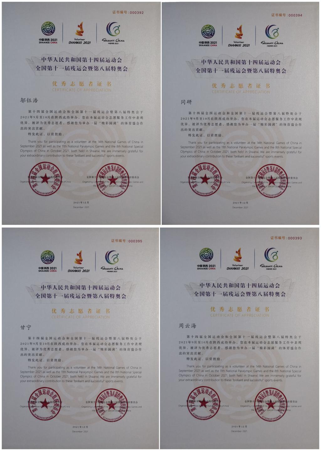 近日,第十四届全国运动会组织委员会办公室和全国第十一届残运会暨第八届残奥会组织委员会对在十四运会和残特奥会期间表现突出的志愿服务工作先进单位和个人予以表彰,威尼斯官网荣获十四运会和残特奥会志愿服务“先进单位”称号,邬钰浩等4名同学荣获十四运会和残特奥运会“优秀志愿者”称号。