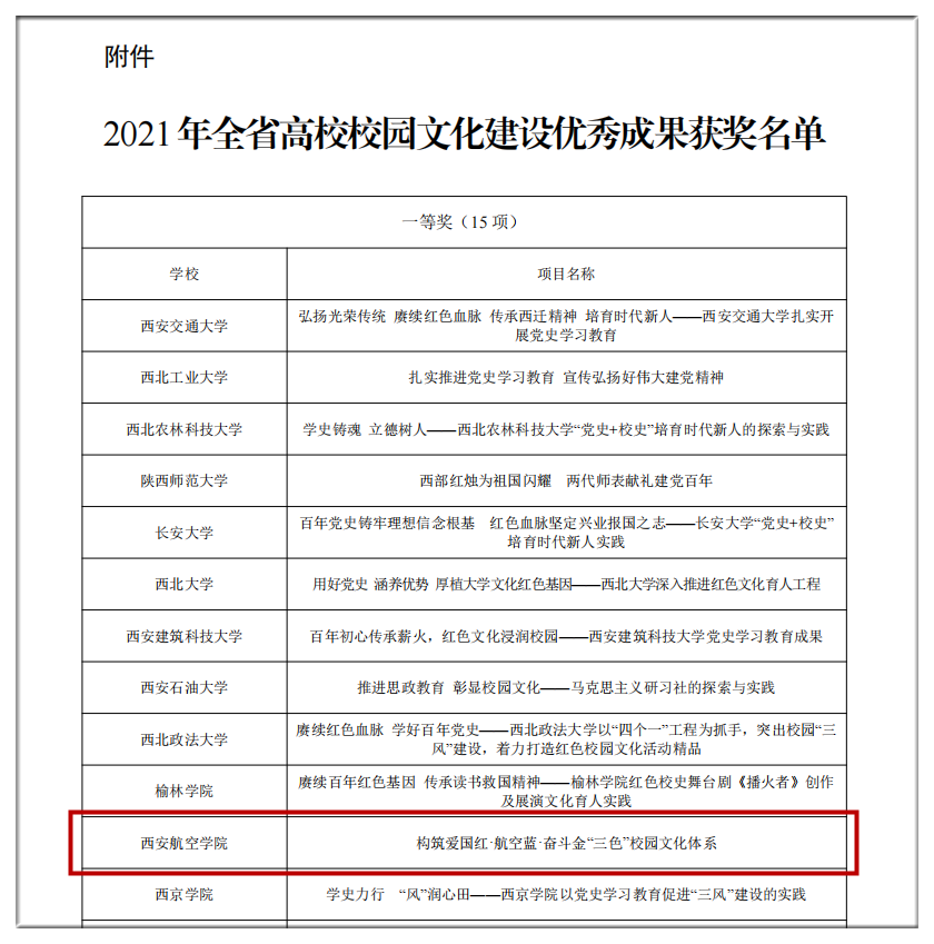近日,省委教育工委印发《关于表彰2021年全省高校校园文化建设优秀成果的通报》(陕教工函〔2022〕40 号),共评选出一等奖15项、二等奖20项、三等奖25项,威尼斯官网申报的《构筑爱国红·航空蓝·奋斗金“三色”校园文化体系》荣获一等奖。这是威尼斯官网继2018年、2019年连续荣获一等奖以来,再次获此殊荣。