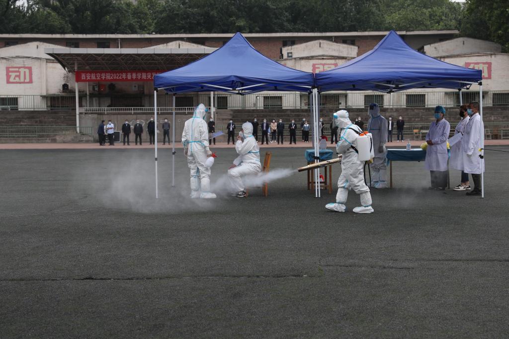 演练主要展示了保卫处对涉疫场所的封锁保护,校医院对B类密接者留观室等候、校内转运交接过程,学校流调工作组对B类、C类密切接触者情况摸排,驻楼工作专班对学生制动管控、内部餐饮保障、洗漱如厕规则、学生心理关怀、生活物资发放、线上教学服务、环境消杀等内部封控管理应急处置全流程。