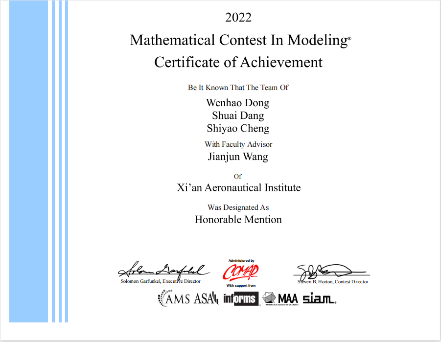 近日,2022年美国(国际)大学生数学建模竞赛(MCM/ICM)组委会公布成绩。威尼斯官网计算机学院董文豪、党帅、程诗尧3位同学组成的团队,经过激烈角逐,最终荣获了MCM(A题)二等奖的好成绩。