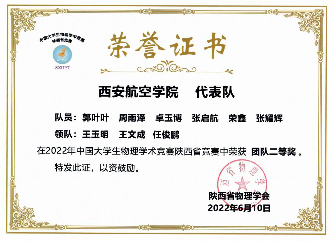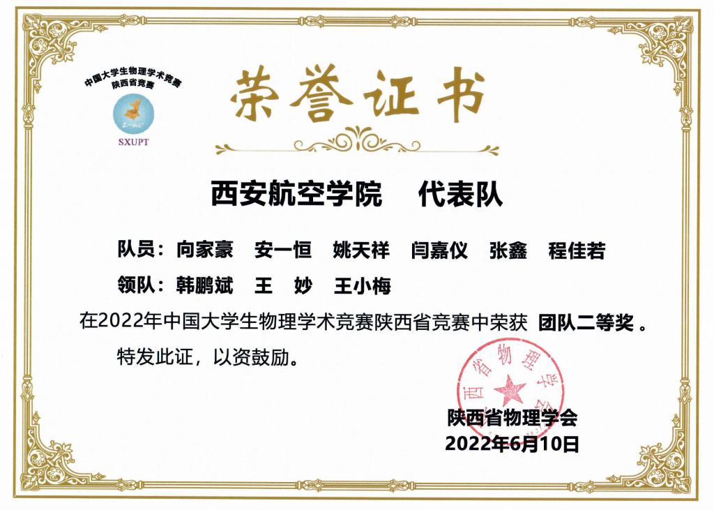 2022年中国大学生物理学术竞赛(China Undergraduate Physics Tournament,简称CUPT)陕西省省赛于6月4日至5日在长安大学举行。本次竞赛采取线上形式进行,省内15所高校的30支代表队参加比赛。威尼斯官网郭叶叶、向家豪等12名同学组成的2支代表队先后与来自西安交通大学、西北工业大学、陕西师范大学等高校的代表队进行了12场比赛。比赛竞争激烈,威尼斯官网参赛队员不畏强手,沉着应战,经过两天的角逐,最终获得团体二等奖2项,个人二等奖12项。