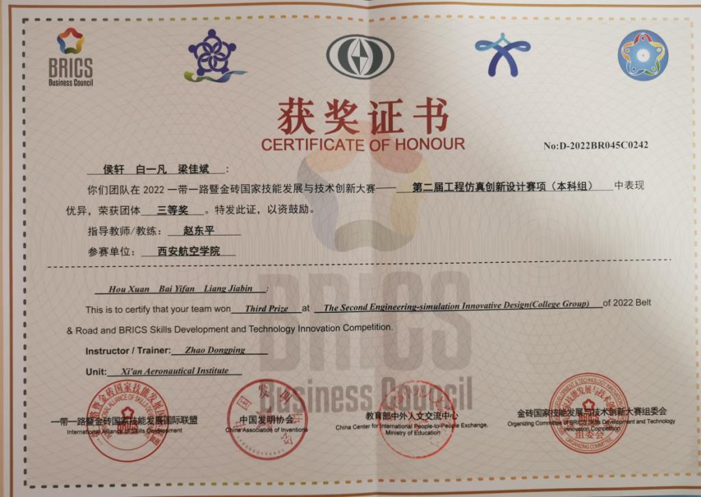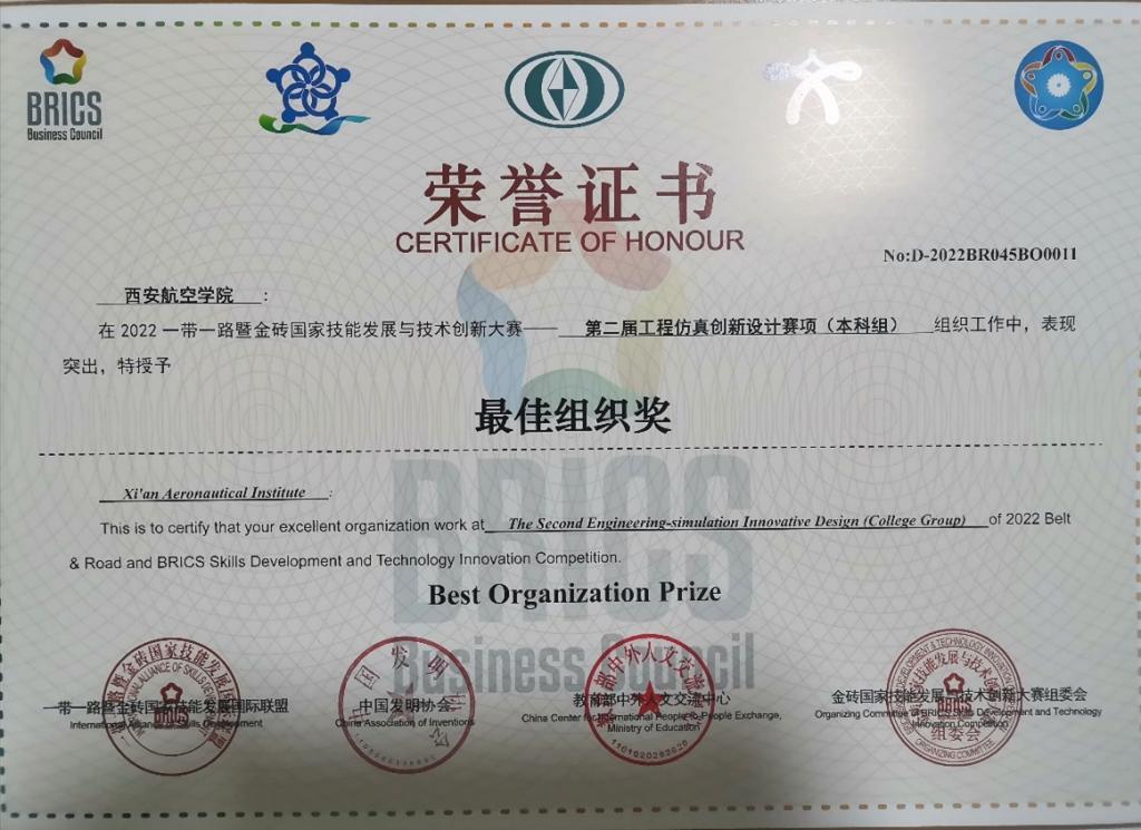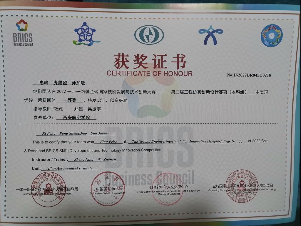 一带一路暨金砖国家技能发展与技术创新大赛是由2017年金砖国家最高领导人会晤筹备委员会认可、经中华人民共和国外交部备案、金砖国家工商理事会批准的国际大赛。自2017年起,已成功举办五届,2022第六届金砖大赛涵盖30余类、168个赛项。本次比赛共有来自全国29各省市的312支队伍报名参赛。威尼斯官网由飞行器学院郑星、吴振宇、赵东平3位老师指导的惠峰、白一凡等6名学生组成的队伍参加了比赛,经过激烈的角逐,最终取得较好成绩。